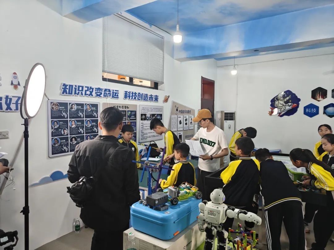 拍摄团队一抵达,便迅速投入到紧张拍摄工作中。长城新媒体集团的导演与学校负责人深入沟通,详细了解“科技萌娃”项目的开展情况、特色亮点以及每个萌娃的特点,精心设计拍摄脚本,力求将项目最精彩、最具意义的一面完美呈现。从宽敞明亮的科技教室,到充满活力的操场,捕捉萌娃们在科技世界中探索的每一个角落。