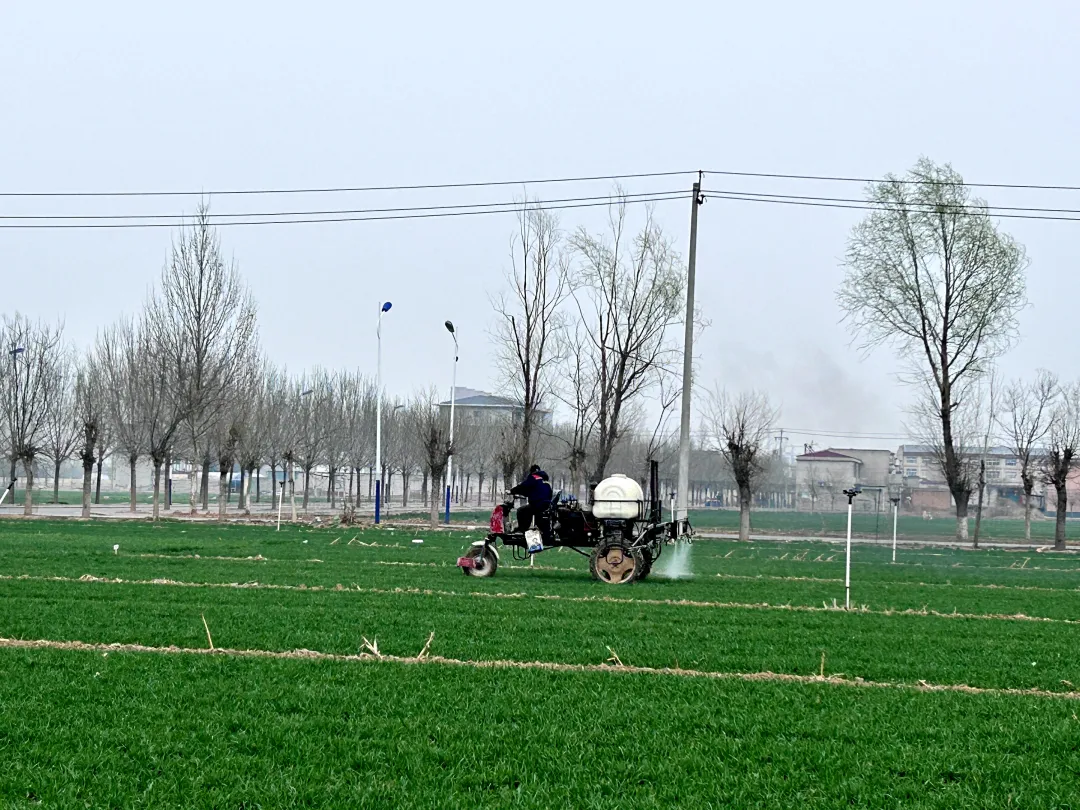 走进朱家庄村良繁基地,连片的麦田绿意葱茏,茁壮的麦苗迎着春风舒展枝叶。田间地头,农机轰鸣作响,一台自走式喷药机平稳穿梭于麦田之间,雾化的药剂均匀洒落,精准覆盖每一株麦苗,高效开展除草作业,助力小麦健康生长。
