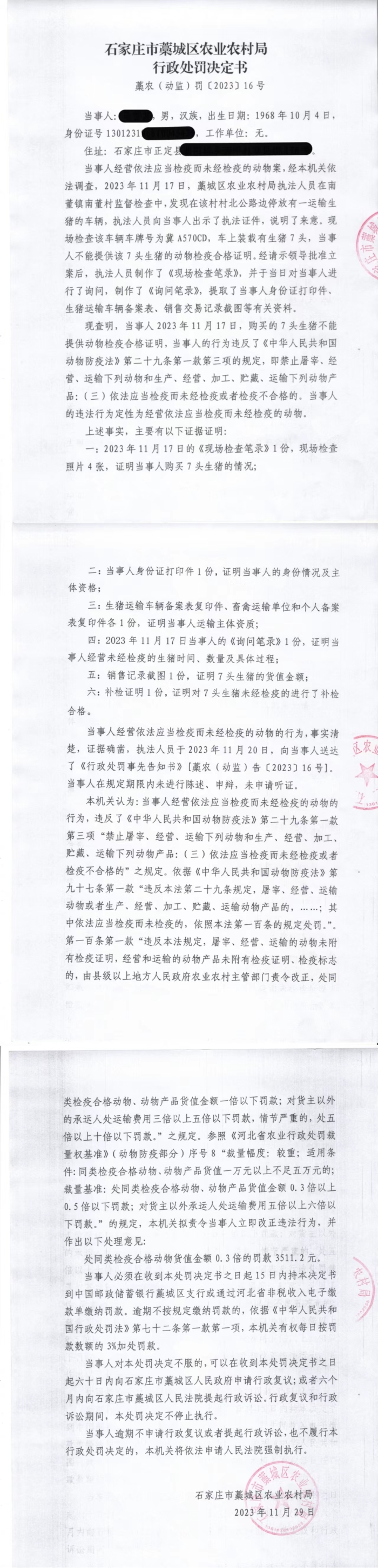 藁农(动监)罚【2023】16号