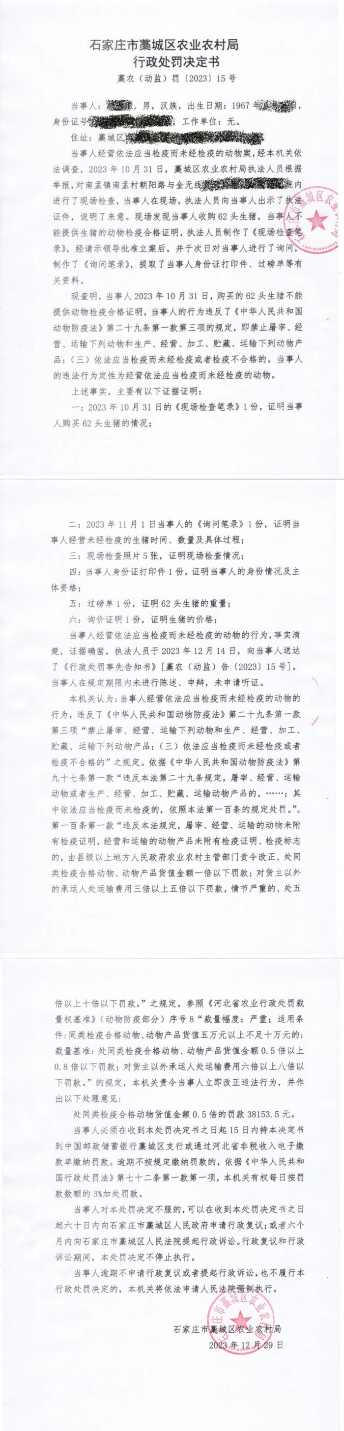 藁农(饲料)罚【2023】9号、藁农(动监)罚【2023】15号