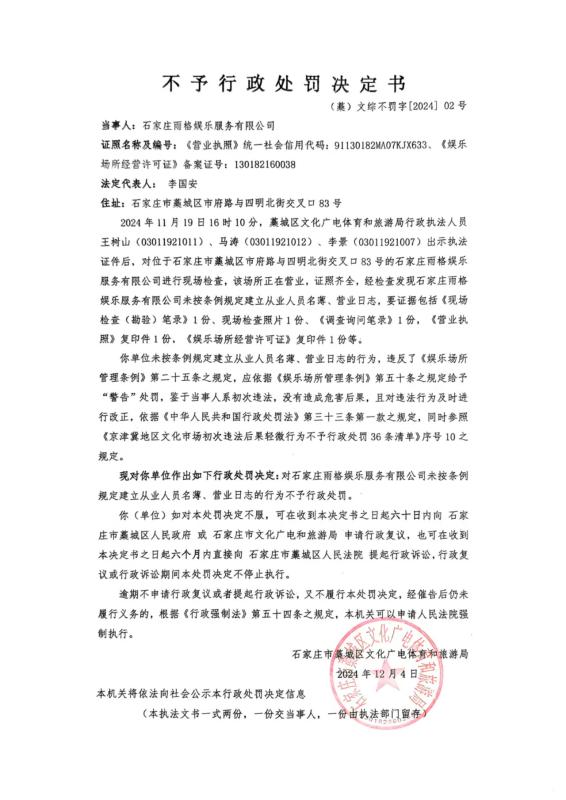 不予行政处罚决定公示(石家庄雨格娱乐服务有限公司)