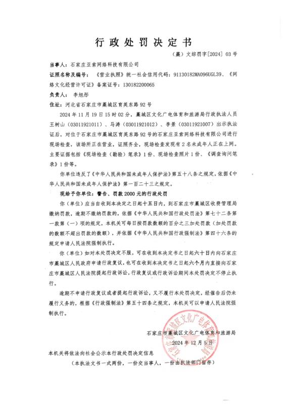 行政处罚决定公示(石家庄亚索网络科技有限公司 )