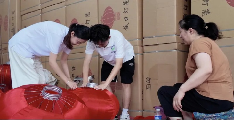 (图:团队成员体验宫灯制作)