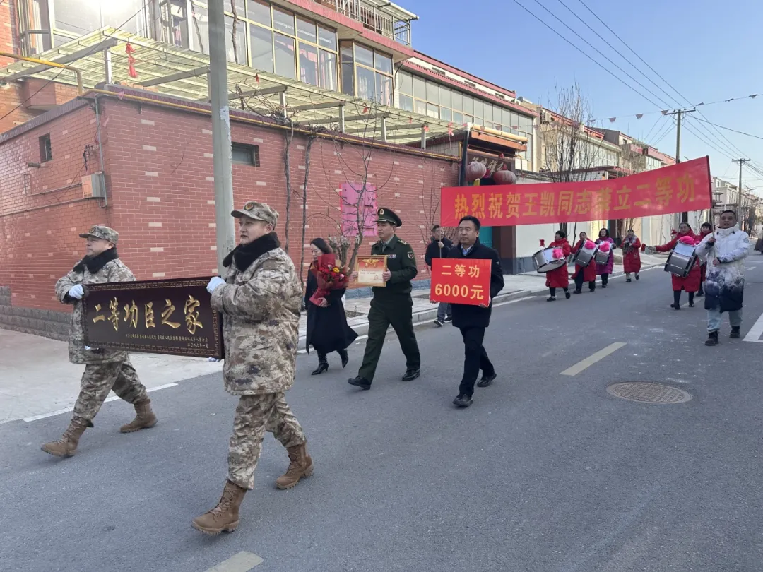 1月21日上午,由藁城区人武部、区退役军人事务局、廉州镇人民政府主要负责同志组成的送喜报队伍,带着党和政府的关怀与全区人民的敬意,敲锣打鼓来到现役军人王凯家中,将沉甸甸的二等功喜报、“二等功臣之家”荣誉牌匾送到其家属手中,共同见证这份属于军人与军属的荣耀时刻。