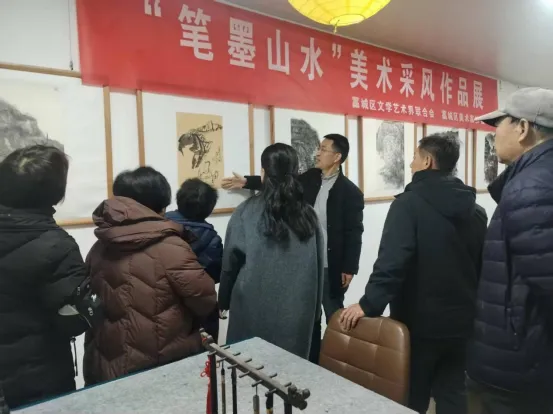 本次展览由区文联主办,区美术家协会、何国进美术家工作室、站南街社区承办。前期,精心组织区内书画名家及骨干创作者深入农村、滹沱河景区、太行山区开展秋季采风活动。艺术家们以自然为师、以乡土为韵,运用传统山水画技法勾勒时代乡村新貌,让自然风光与人文底蕴在宣纸上相融共生,创作了一大批优秀美术作品。本次展览精选了35幅采风佳作,作品既坚守传统笔墨精髓,又融入当代审美意趣,或大气磅礴、或清雅隽永。活动现场,区美协的老师还对每幅作品的创作特色、笔法技法进行了深入讲解,从笔墨晕染、构图布局到意境营造,细致拆解创作巧思,让观展群众不仅能赏画,更能懂画,沉浸式感受传统山水书画的独特魅力。众多书画爱好者、市民群众驻足画前,细细品鉴笔墨韵味,感受秋日山水的独特风采,纷纷为作品中蕴含的乡土情怀与艺术张力点赞。