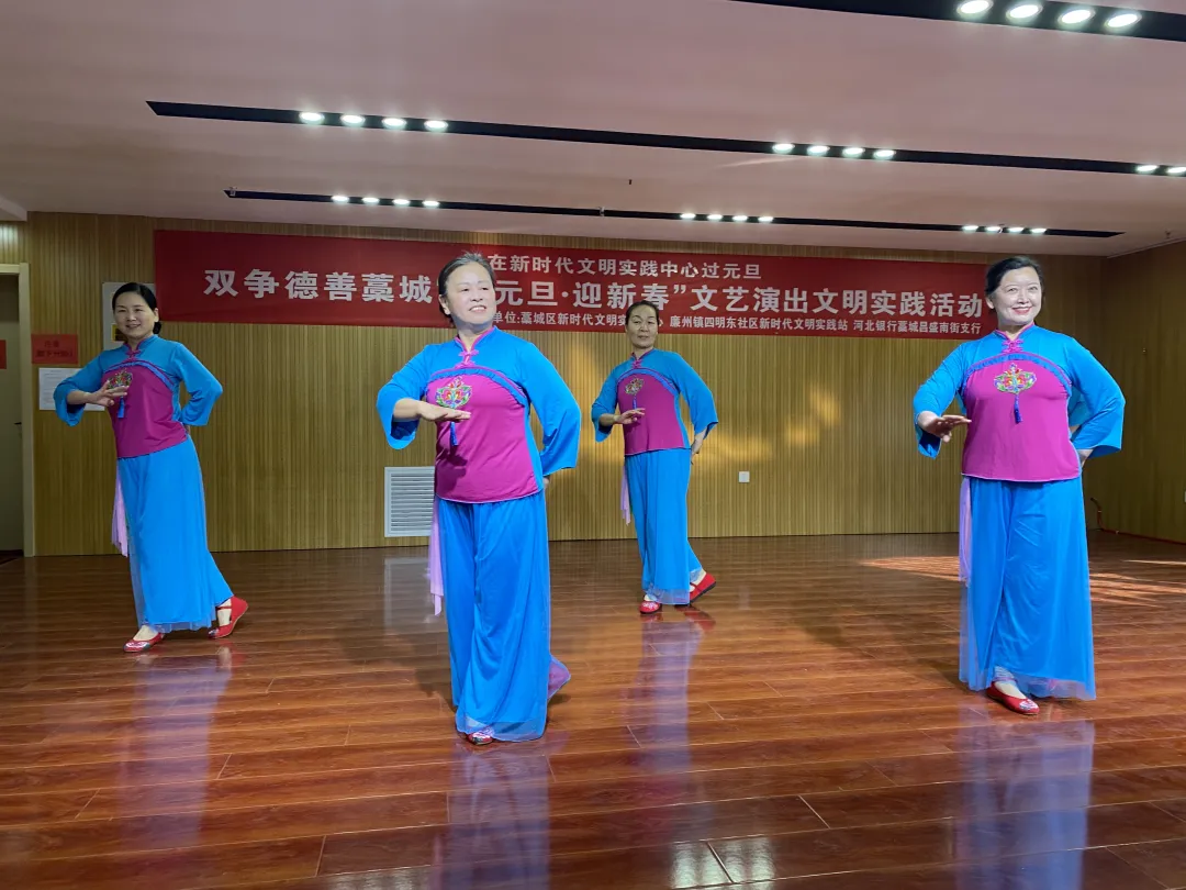 元旦来临之际,藁城区新时代文明实践中心联合廉州镇四明东社区新时代文明实践站、河北银行藁城昌盛南街支行,共同举办“庆元旦・迎新春”文艺演出活动,200余名社区居民欢聚一堂,以“我在新时代文明实践中心过元旦”的别样方式,在歌舞欢腾中迎接新年到来。