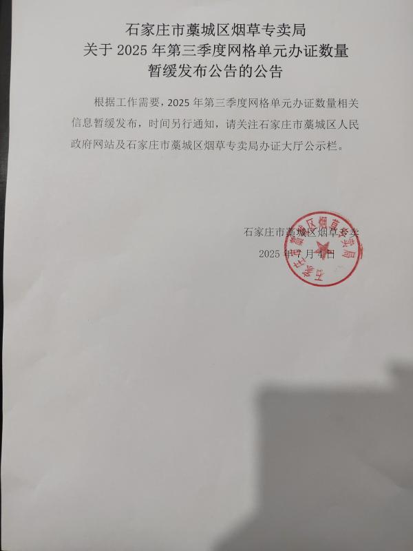 石家庄市藁城区烟草专卖局关于2025年第三季度网格单元办证数量暂缓发布公告的公告