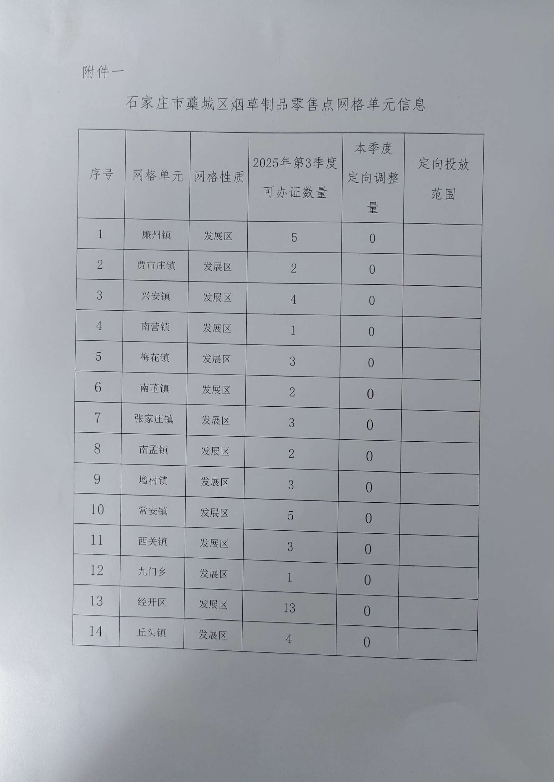 为加强烟草专卖零售许可证管理,规范烟草制品经营秩序,优化零售点布局,根据《石家庄市藁城区烟草制品零售点合理布局规定》,我局对石家庄市藁城区烟草制品零售点网格单元的性质及可办证数量进行动态管理,现对全年各网格名额《石家庄市藁城区烟草制品零售点网格单元信息》(见附件)进行公示。公示时间截止时间2025年07月22日8时29分59秒。