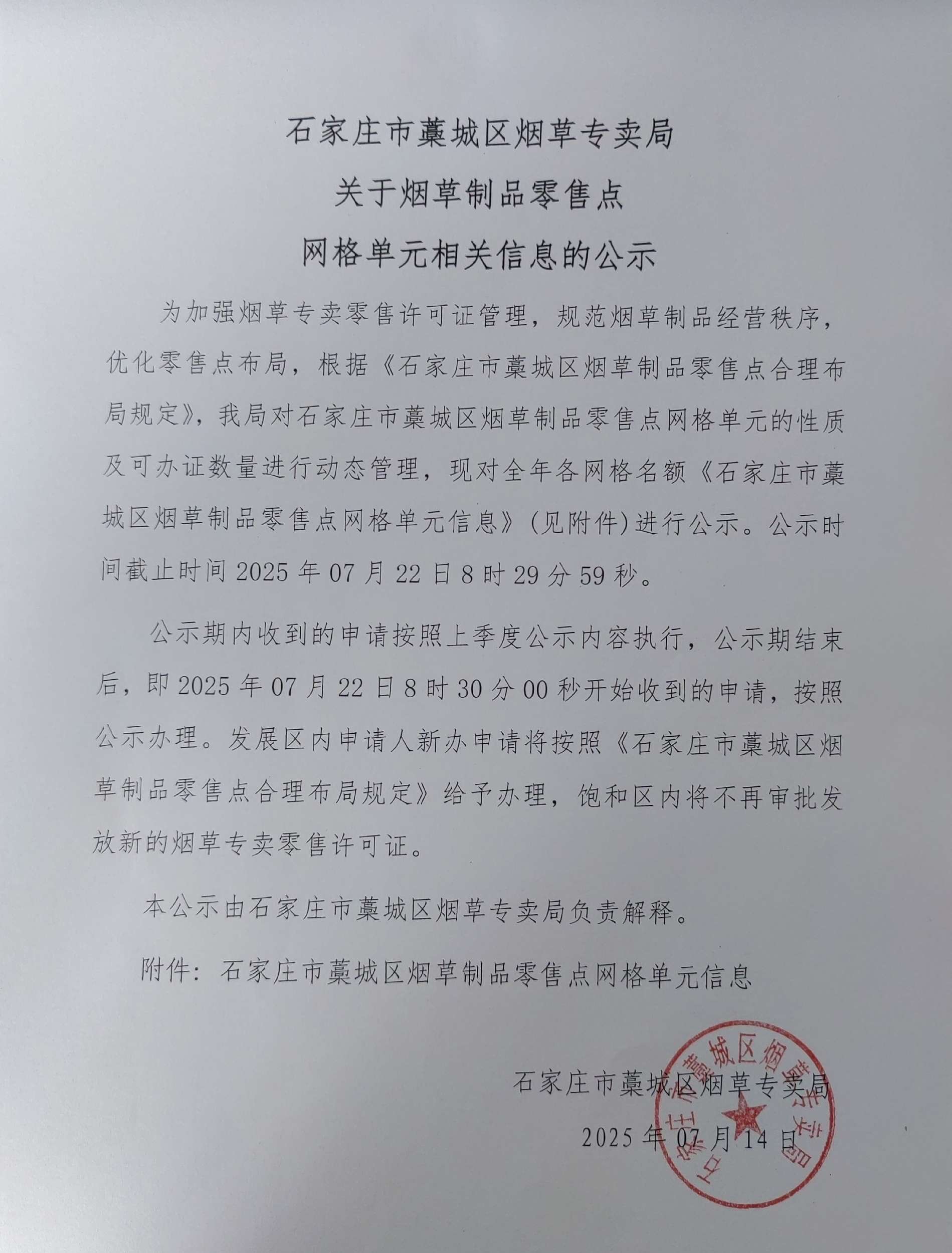 公示期内收到的申请按照上季度公示内容执行,公示期结束后,即2025年07月22日8时30分00秒开始收到的申请,按照公示办理。发展区内申请人新办申请将按照《石家庄市藁城区烟草制品零售点合理布局规定》给予办理,饱和区内将不再审批发放新的烟草专卖零售许可证。