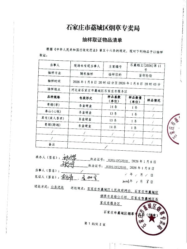 石家庄市藁城区烟草专卖局抽样取证物品清单 石藁烟立【2026】第11号