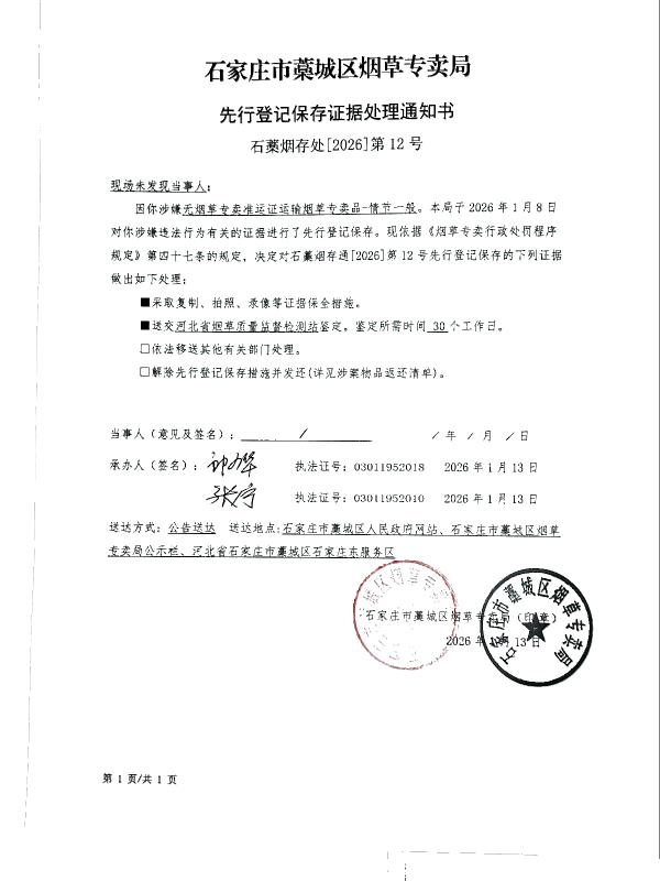石家庄市藁城区烟草专卖局证据先行登记保存处理通知书 石藁烟存处【2026】第12号