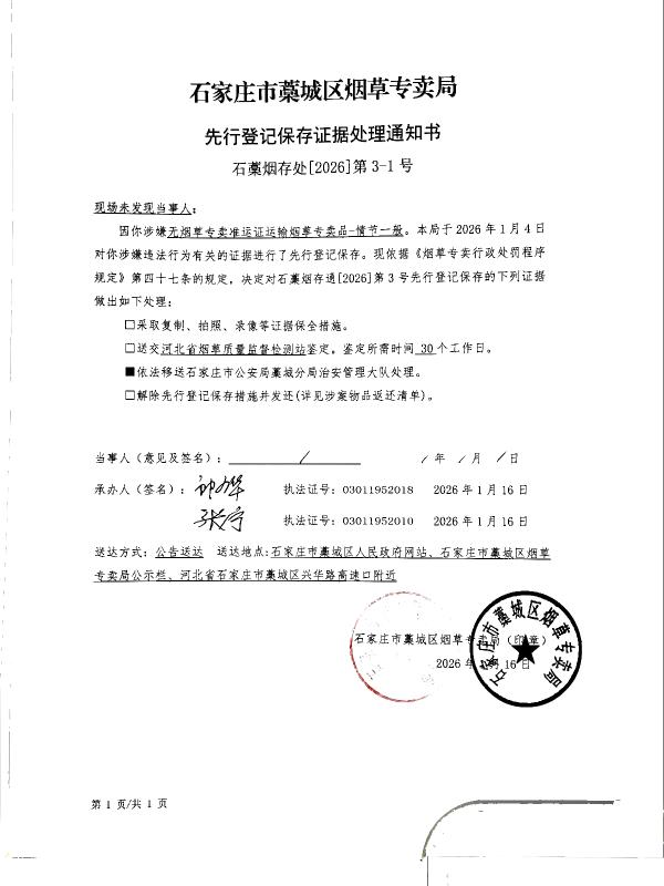 石家庄市藁城区烟草专卖局证据先行登记保存处理通知书 石藁烟存处【2026】第3-1号