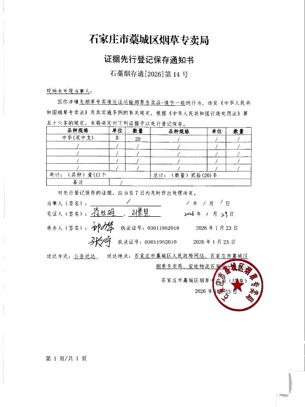 石家庄市藁城区烟草专卖局证据先行登记保存通知书 石藁烟存通【2026】第14号