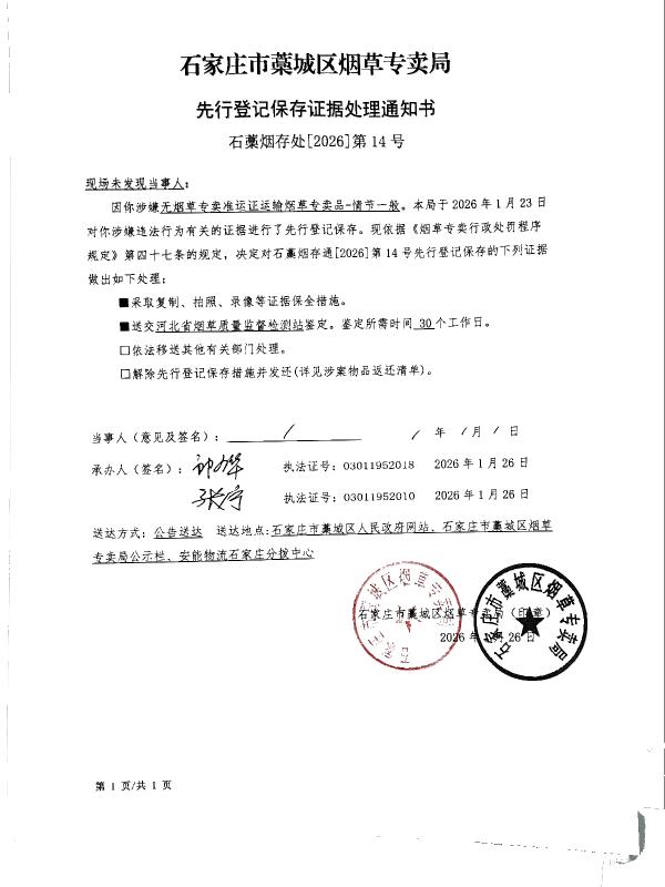 石家庄市藁城区烟草专卖局证据先行登记保存处理通知书 石藁烟存处【2026】第14号
