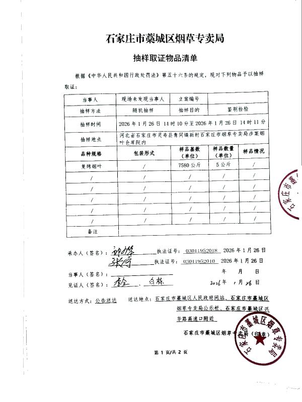 石家庄市藁城区烟草专卖局抽样取证物品清单 石藁烟立【2026】第16号
