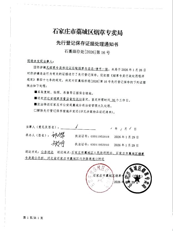 石家庄市藁城区烟草专卖局证据先行登记保存处理通知书 石藁烟存处【2026】第16号