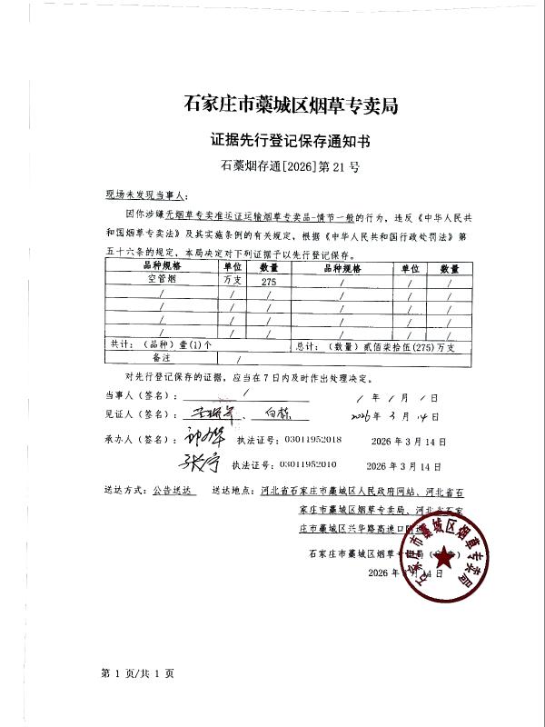 石家庄市藁城区烟草专卖局证据先行登记保存通知书 石藁烟存通【2026】第21号