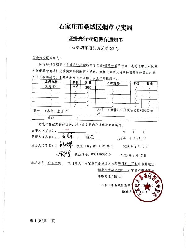 石家庄市藁城区烟草专卖局证据先行登记保存通知书 石藁烟存通【2026】第22号