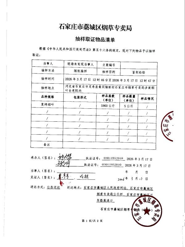 石家庄市藁城区烟草专卖局抽样取证物品清单 石藁烟立【2026】第22号