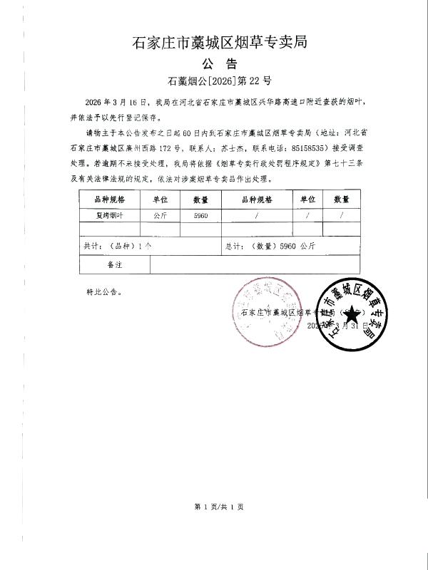 石家庄市藁城区烟草专卖局 公告 石藁烟公【2026】第22号
