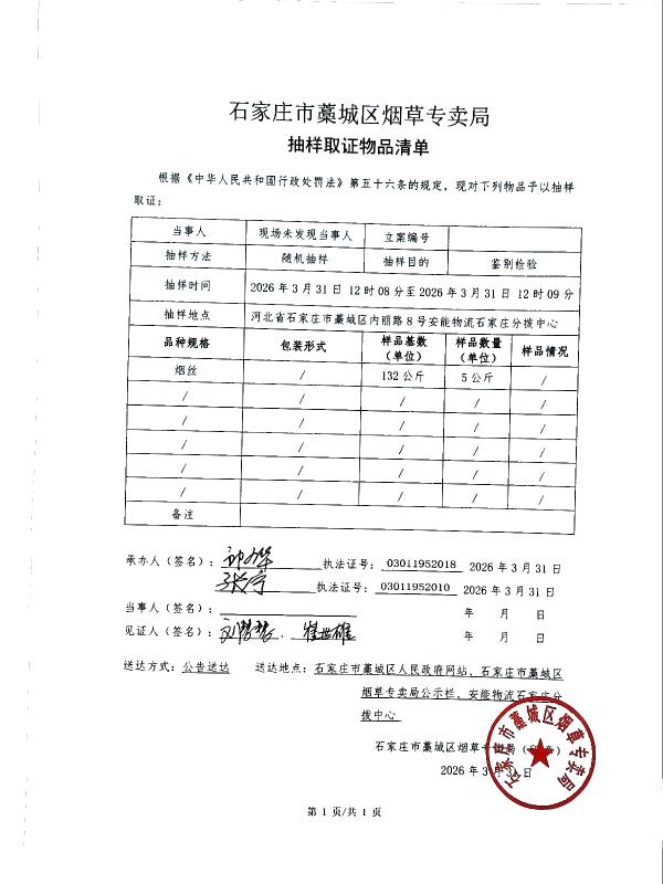 石家庄市藁城区烟草专卖局抽样取证物品清单 石藁烟立【2026】第30号