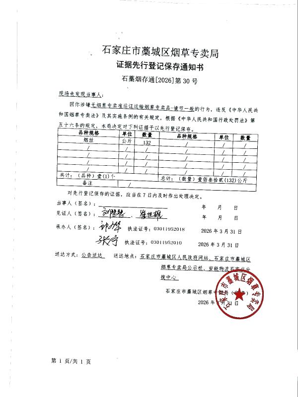 石家庄市藁城区烟草专卖局证据先行登记保存通知书 石藁烟存通【2026】第30号