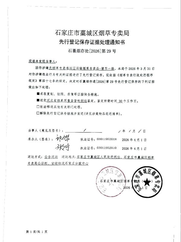 石家庄市藁城区烟草专卖局先行登记保存证据处理通知书 石藁烟存处【2026】第29号