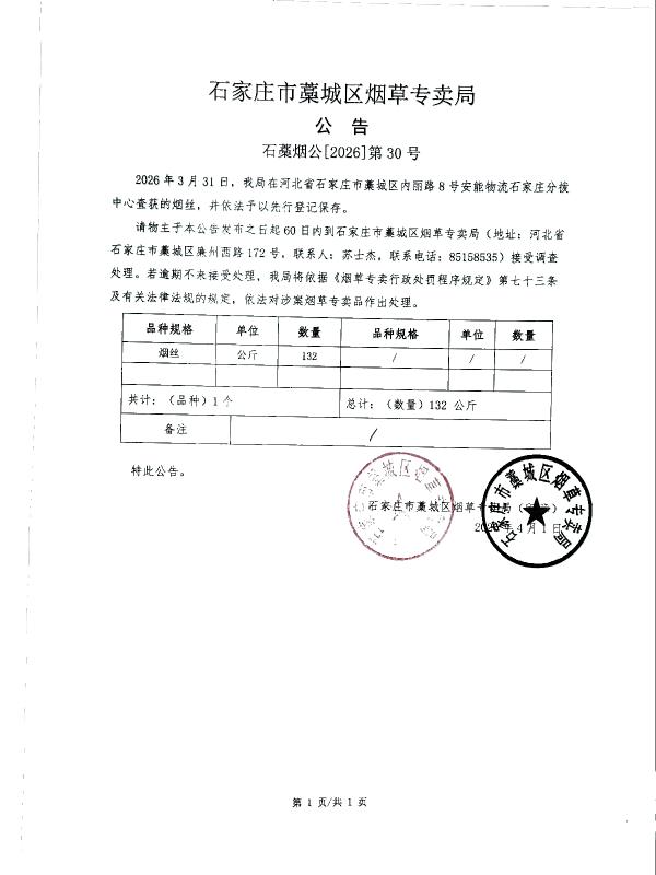 石家庄市藁城区烟草专卖局 公告 石藁烟公【2026】第30号