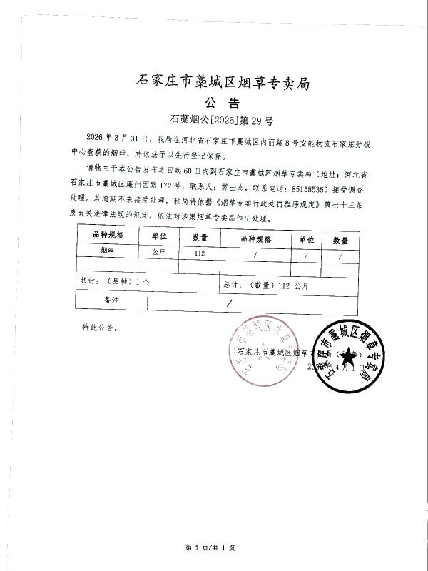石家庄市藁城区烟草专卖局 公告 石藁烟公【2026】第29号