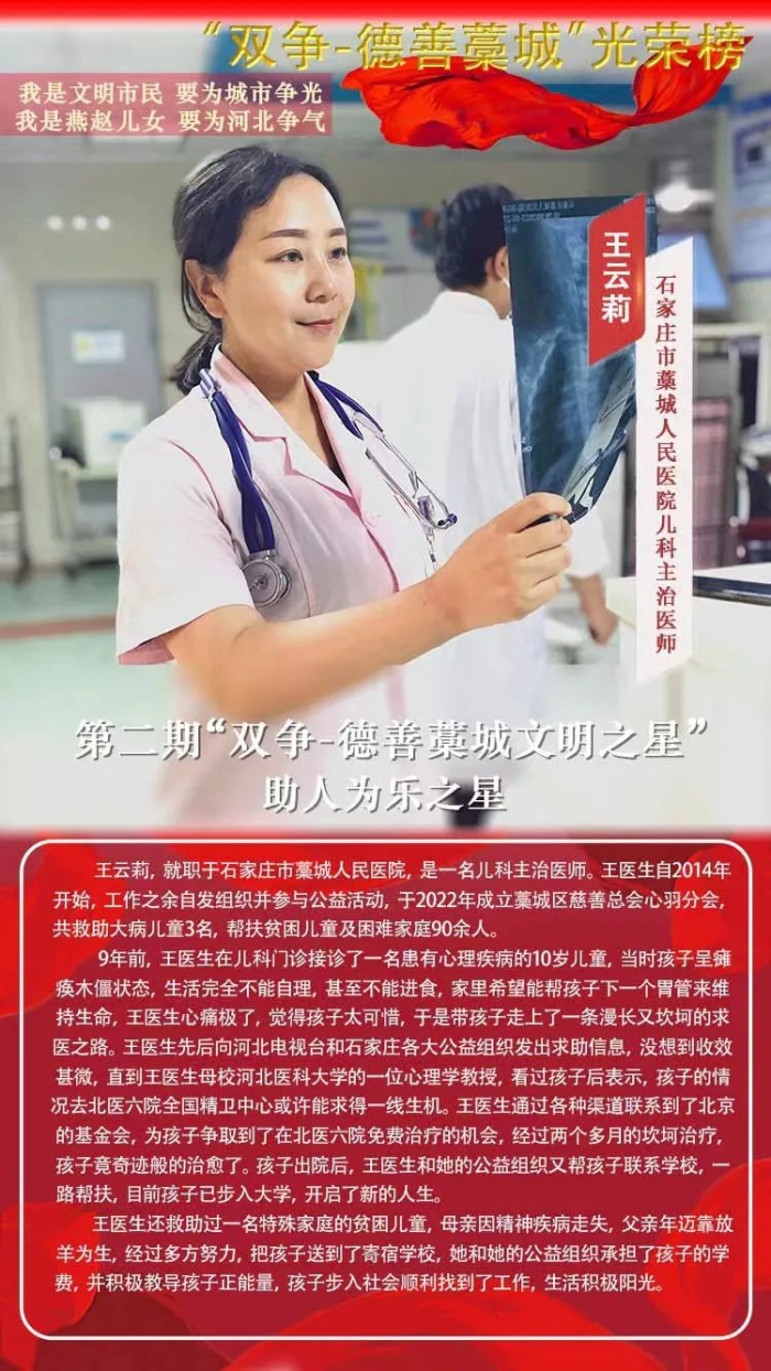 王云莉,就职于石家庄市藁城人民医院,是一名儿科主治医师。自2014年开始,王云莉工作之余自发组织并参与公益活动,于2022年发起成立藁城区慈善总会心羽分会,共救助大病儿童3名,帮扶贫困儿童及困难家庭90余人。
