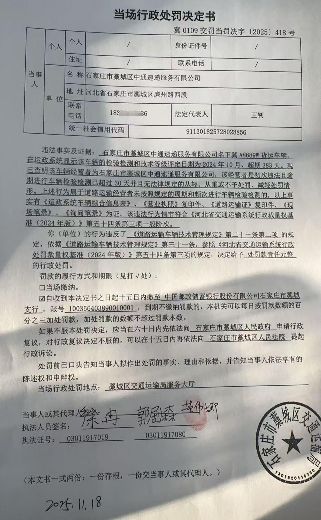 | 石家庄市藁城区中通速递服务有限公司 | 法人 | 911301825728028856 | 王钊 | 身份证 | 130182********4412 | 冀0109交罚当罚决字【2025】418号 | 《道路运输车辆技术管理规定》第二十一条第二项 | 石家庄市藁城区中通速递服务有限公司名下冀A8689W未按照规定的周期和频次进行车辆检验检测 | 《道路运输车辆技术管理规定》第三十一条和参照《河北省交通运输系统行政处罚裁量权基准(2024年版)》(行政处罚)第五十四条第三项 | 罚款 | 0.1 | 2025.11.18 | 藁城区交通运输局 | FA06-002-15 |