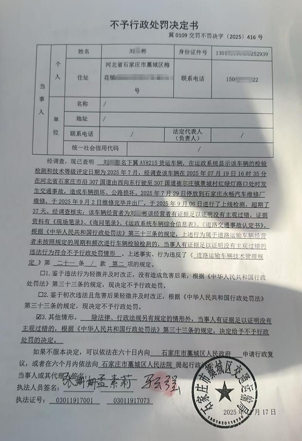 | 刘*彬 | 自然人 | 身份证 | 130182********2939 | 冀0109交罚不罚决字〔2025〕416号 | 《道路运输车辆技术管理规定》第二十一条第二项 | 刘*彬名下冀AY8215未按照规定的周期和频次进行车辆检验检测的案 | 依据《道路运输车辆技术管理规定》第三十一条和参照《中华人民共和国行政处罚法》第三十三条的规定 | 不予处罚 | 2025.11.17 | 藁城区交通运输局 | FA06-002-15 |