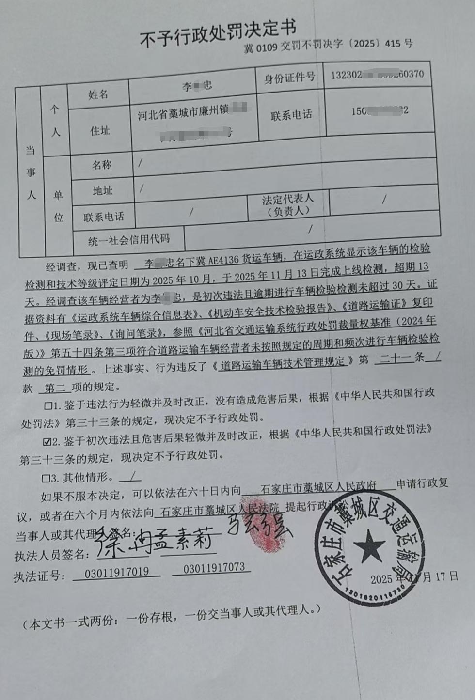 | 李*忠 | 自然人 | 身份证 | 132302********0370 | 冀0109交罚不罚决字〔2025〕415号 | 《道路运输车辆技术管理规定》第二十一条第二项 | 李*忠名下冀AE4136未按照规定的周期和频次进行车辆检验检测的案 | 依据《道路运输车辆技术管理规定》第三十一条,参照《中华人民共和国行政处罚法》第五十四条第三项的规定 | 不予处罚 | 2025.11.17 | 藁城区交通运输局 | FA06-002-15 |