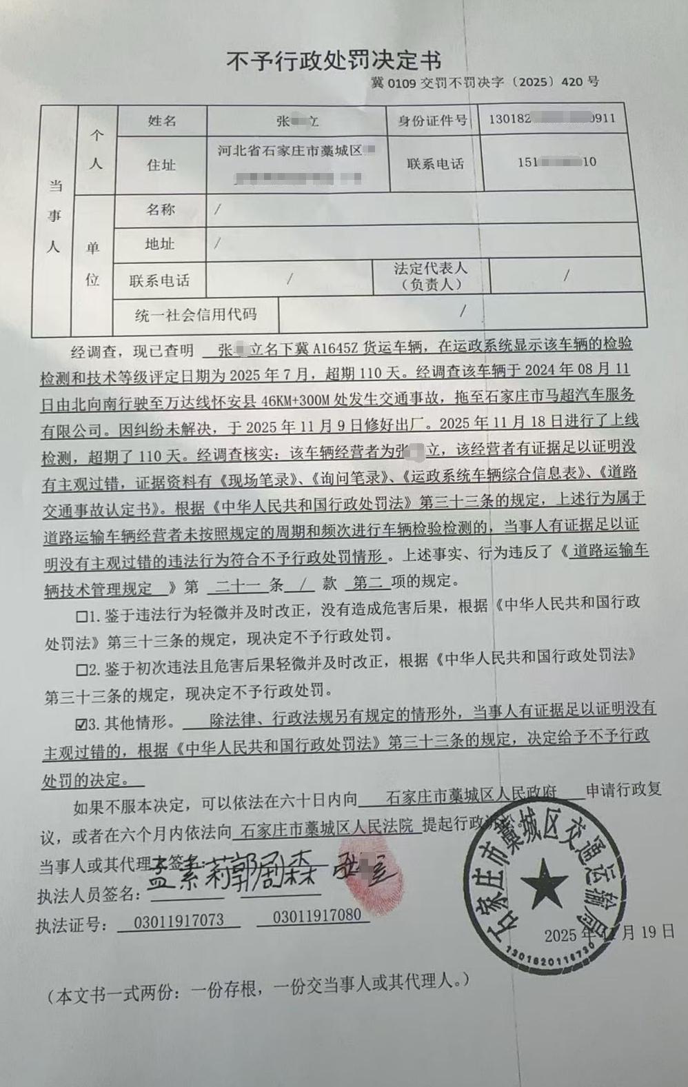 | 张*立 | 自然人 | 身份证 | 130182********0911 | 冀0109交罚不罚决字〔2025〕420号 | 《道路运输车辆技术管理规定》第二十一条第二项 | 张*立名下冀A1645Z未按照规定的周期和频次进行车辆检验检测的案 | 依据《道路运输车辆技术管理规定》第三十一条和参照《河北省交通运输系统行政处罚裁量权基准(2024年版)》(行政处罚)第五十四条第三项的规定 | 不予处罚 | 2025.11.19 | 藁城区交通运输局 | FA06-002-15 |