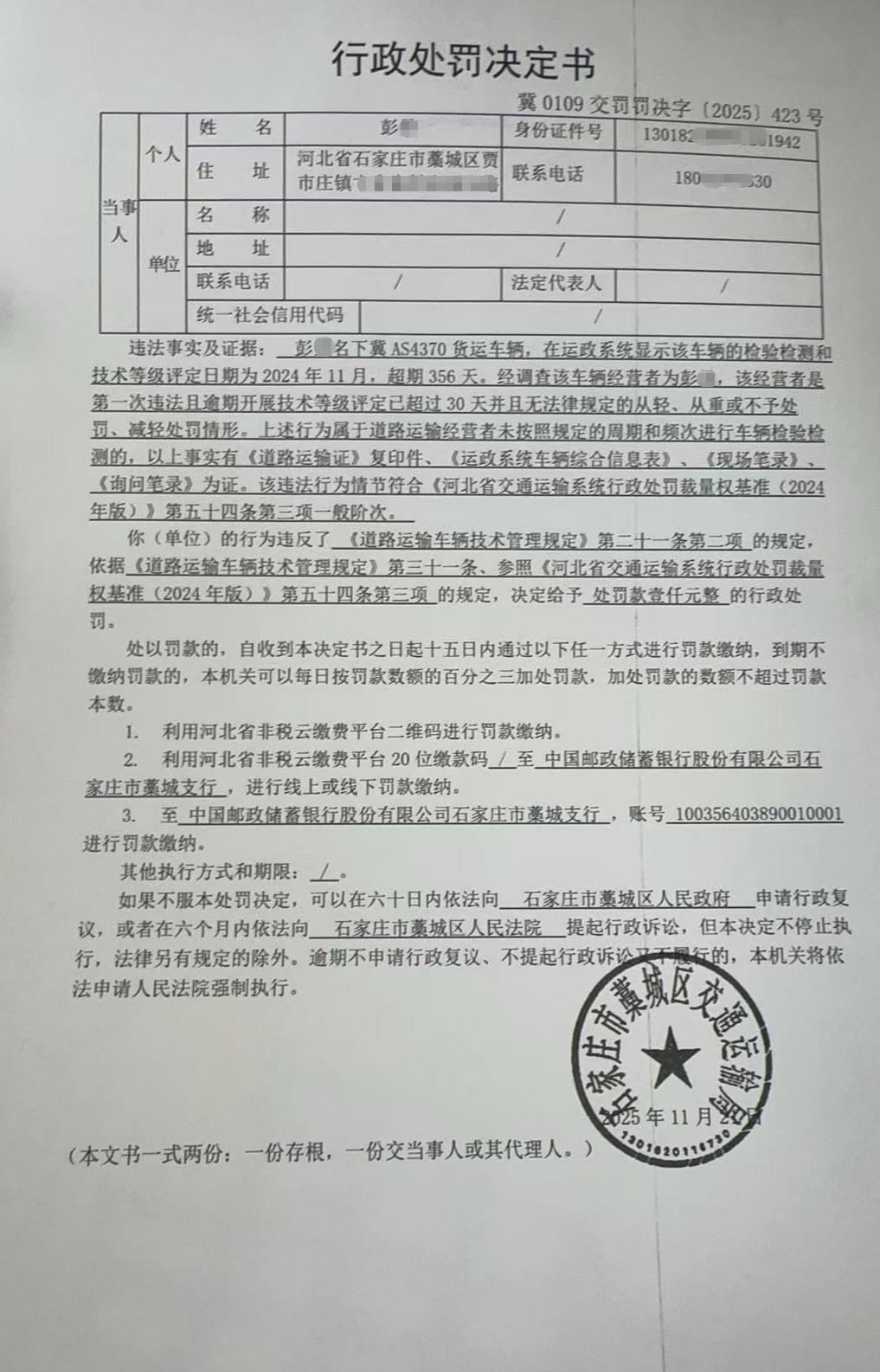 | 彭* | 自然人 | 身份证 | 130182********1942 | 冀0109交罚罚决字【2025】423号 | 《道路运输车辆技术管理规定》第二十一条第二项 | 彭*名下冀AS43705货运车辆未按照规定的周期和频次进行车辆检验检测的案 | 《道路运输车辆技术管理规定》第三十一条和参照《河北省交通运输系统行政处罚裁量权基准(2024年版)》(行政处罚)第五十四条第三项 | 罚款 | 0.1 | 2025.11.18 | 藁城区交通运输局 | FA06-002-15 |