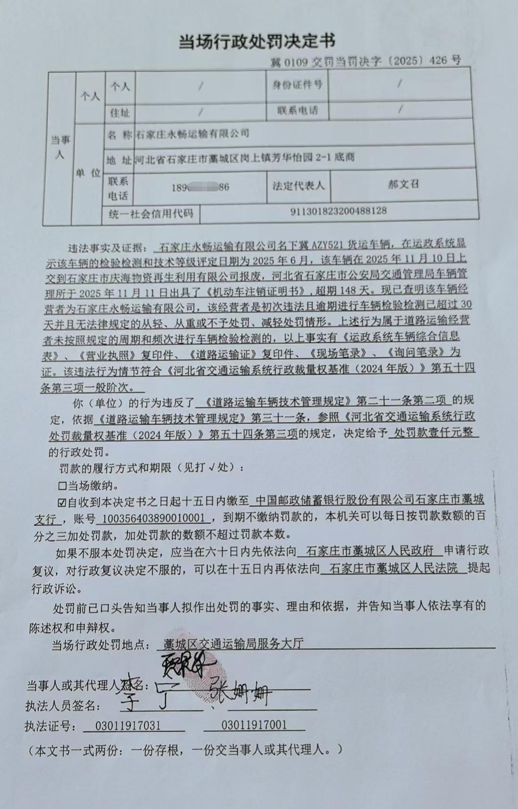 | 石家庄永畅运输有限公司 | 法人 | 911301823200488128 | 郝文召 | 身份证 | 130182********3550 | 冀0109交罚当罚决字【2025】426号 | 《道路运输车辆技术管理规定》第二十一条第二项 | 石家庄永畅运输有限公司冀AZY521未按照规定的周期和频次进行车辆检验检测的案 | 依据《道路运输车辆技术管理规定》第三十一条,参照《中华人民共和国行政处罚法》第五十四条第三项的规定 | 罚款 | 0.1 | 2025.11.26 | 藁城区交通运输局 | FA06-002-15 |