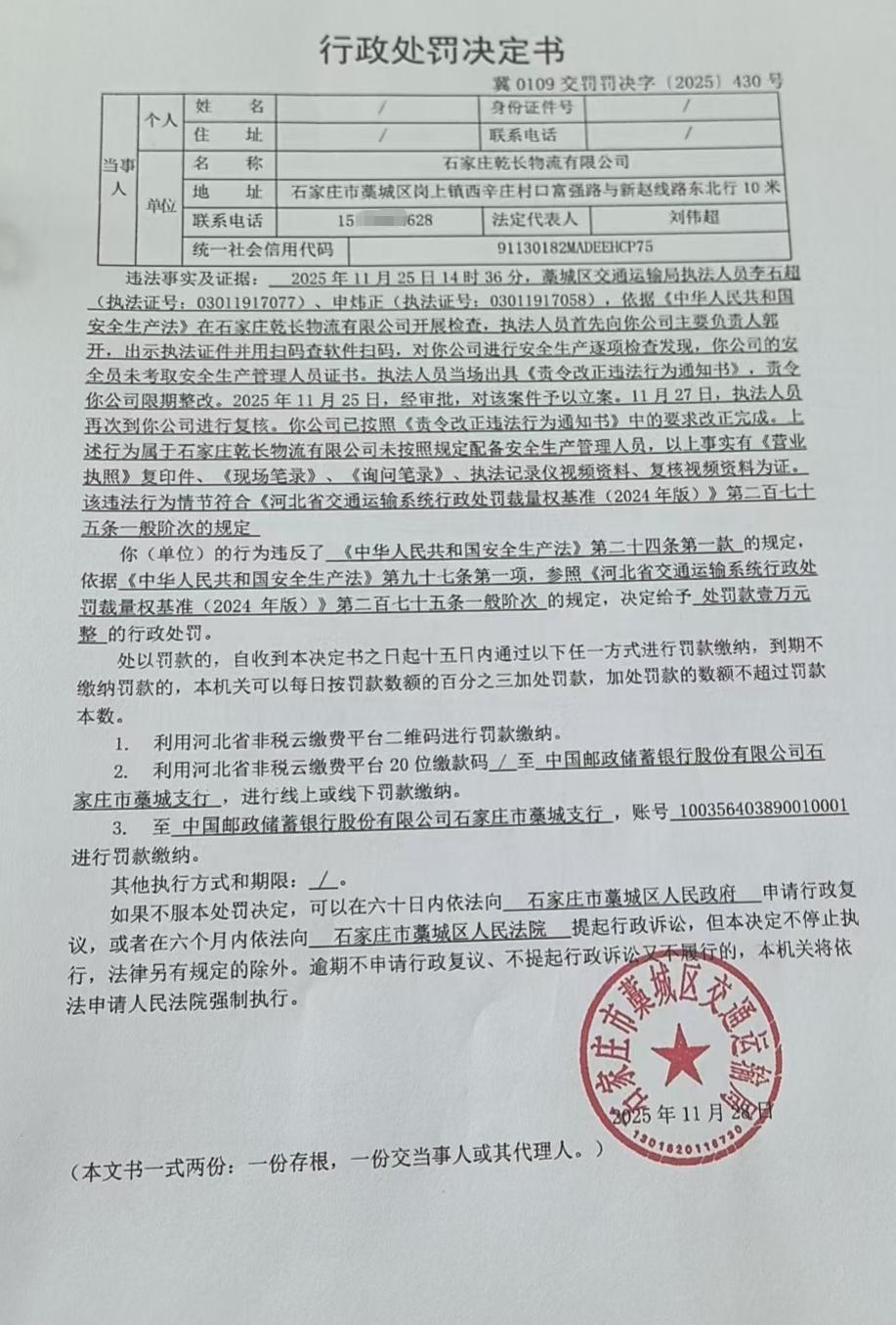 | 石家庄乾长物流有限公司 | 法人 | 91130182MADEEHCP75 | 刘伟超 | 身份证 | 130182********1637 | 冀0109交罚罚决字【2025】430号 | 《中华人民共和国安全生产法》第二十四条第一款 | 石家庄乾长物流有限公司涉嫌未按照规定配备安全生产管理人员的案 | 《中华人民共和国安全生产法》第九十七条第一项,参照《河北省交通运输系统行政处罚裁量权基准(2024年版)》第二百七十五条 | 罚款 | 1 | 2025.11.28 | 藁城区交通运输局 | FA06-002-15 |