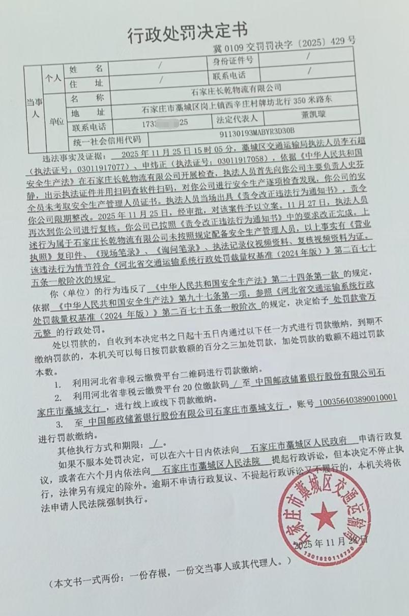 | 石家庄长乾物流有限公司 | 法人 | 91130193MABYR3D30B | 董凯璇 | 身份证 | 130132********0016 | 冀0109交罚罚决字【2025】429号 | 《中华人民共和国安全生产法》第二十四条第一款 | 石家庄长乾物流有限公司涉嫌未按照规定配备安全生产管理人员的案 | 《中华人民共和国安全生产法》第九十七条第一项,参照《河北省交通运输系统行政处罚裁量权基准(2024年版)》第二百七十五条 | 罚款 | 1 | 2025.11.28 | 藁城区交通运输局 | FA06-002-15 |