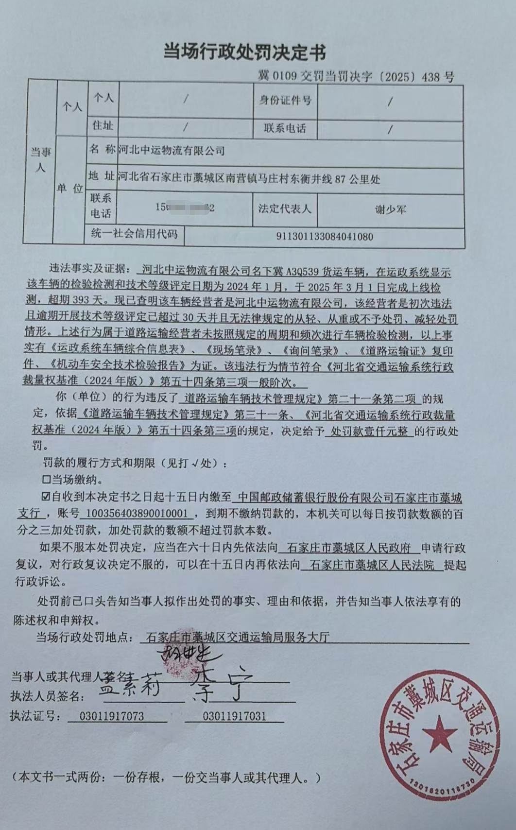 藁城区交通运输局行政处罚公示冀0109交罚当罚决字【2025】438号