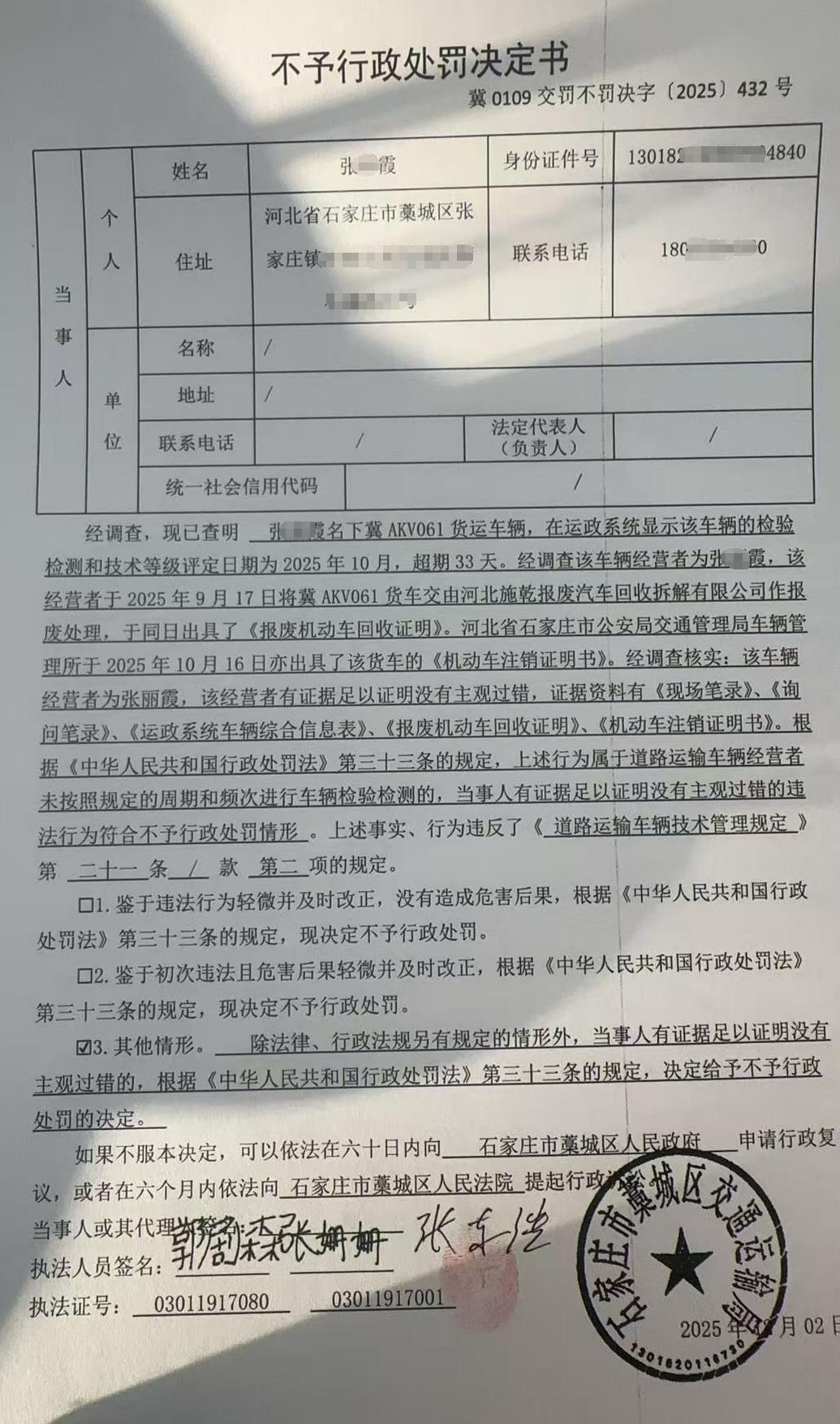 | 张*霞 | 自然人 | 身份证 | 130182********4840 | 冀0109交罚不罚决字〔2025〕432号 | 《道路运输车辆技术管理规定》第二十一条第二项 | 张*霞名下冀AKV061未按照规定的周期和频次进行车辆检验检测的案 | 依据《道路运输车辆技术管理规定》第三十一条和参照《河北省交通运输系统行政处罚裁量权基准(2024年版)》(行政处罚)第五十四条第三项的规定 | 不予处罚 | 2025.12.2 | 藁城区交通运输局 | FA06-002-15 |
