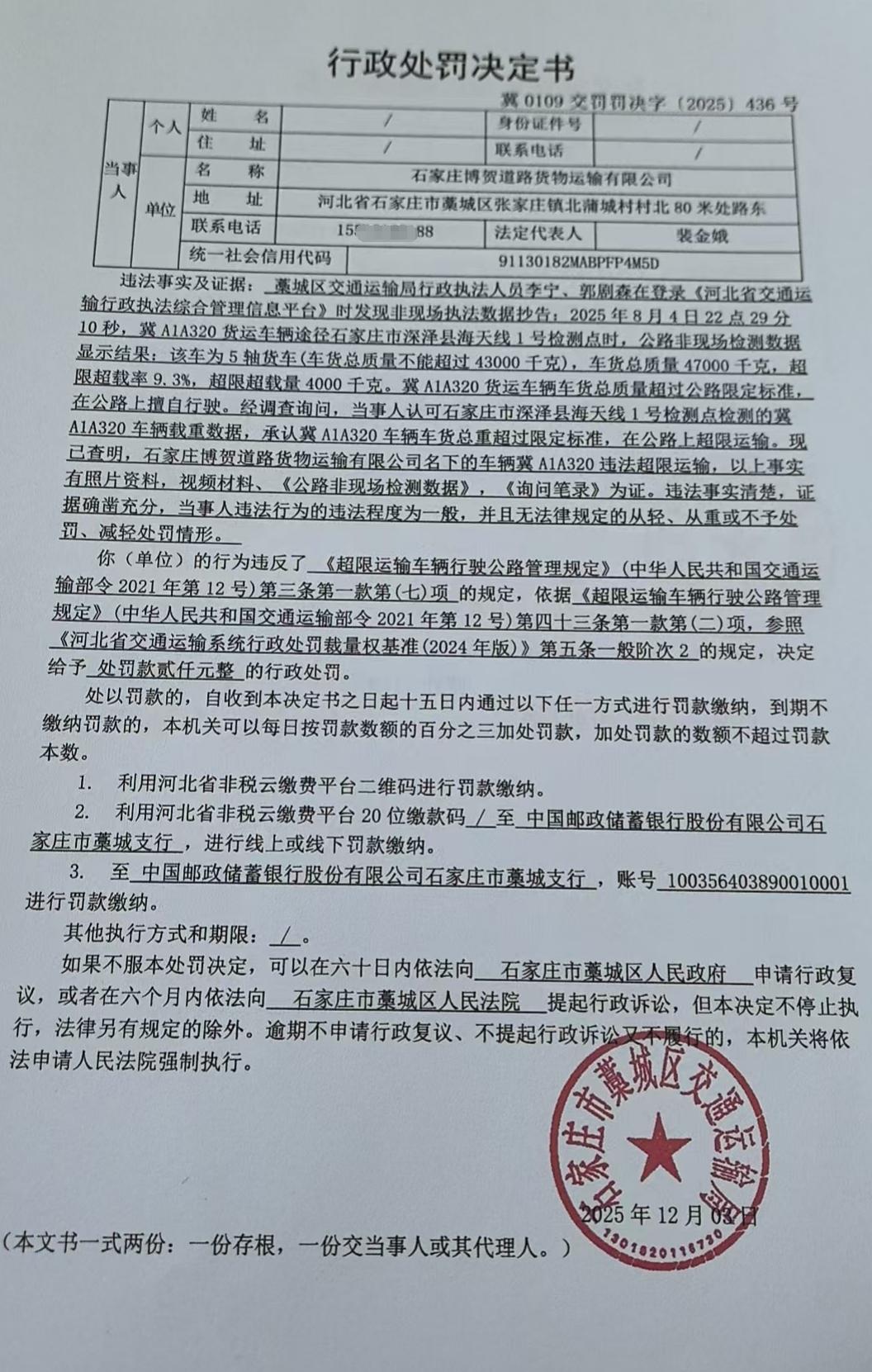 | 石家庄博贺道路货物运输有限公司 | 法人 | 91130182MABPFP4M5D | 裴金娥 | 身份证 | 132325********4827 | 冀0109交罚罚决字【2025】436号 | 《超限运输车辆行驶公路管理规定》(中华人民共和国 交通运输部令2021年第12号)第三条第一款第(五)项 | 石家庄博贺道路货物运输有限公司名下冀A1A320违法超限运输的案 | 《超限运输车辆行驶公路管理规定》(中华人民共和国交通运输部令2021年第12号)第四十三条第一款第(二)项,参照《河北省交通运输系统行政处罚裁量权基准(2024年版)》第五条一般阶次2 | 罚款 | 0.2 | 2025.12.03 | 藁城区交通运输局 | FA06-002-15 |