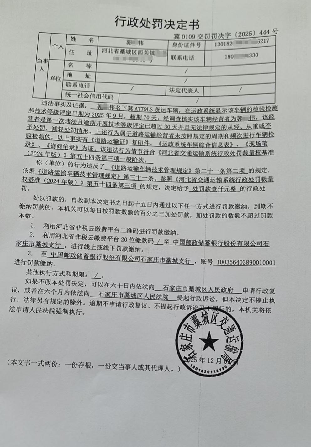 | 郭*伟 | 自然人 | 身份证 | 130182********6217 | 冀0109交罚罚决字【2025】444号 | 《道路运输车辆技术管理规定》第二十一条第二项 | 郭*伟名下冀A779LS未按照规定的周期和频次进行车辆检验检测的案 | 《道路运输车辆技术管理规定》第三十一条,参照《河北省交通运输系统行政处罚裁量权基准(2024年版)》第五十四条第三项 | 罚款 | 0.1 | 2025.12.09 | 藁城区交通运输局 | FA06-002-15 |