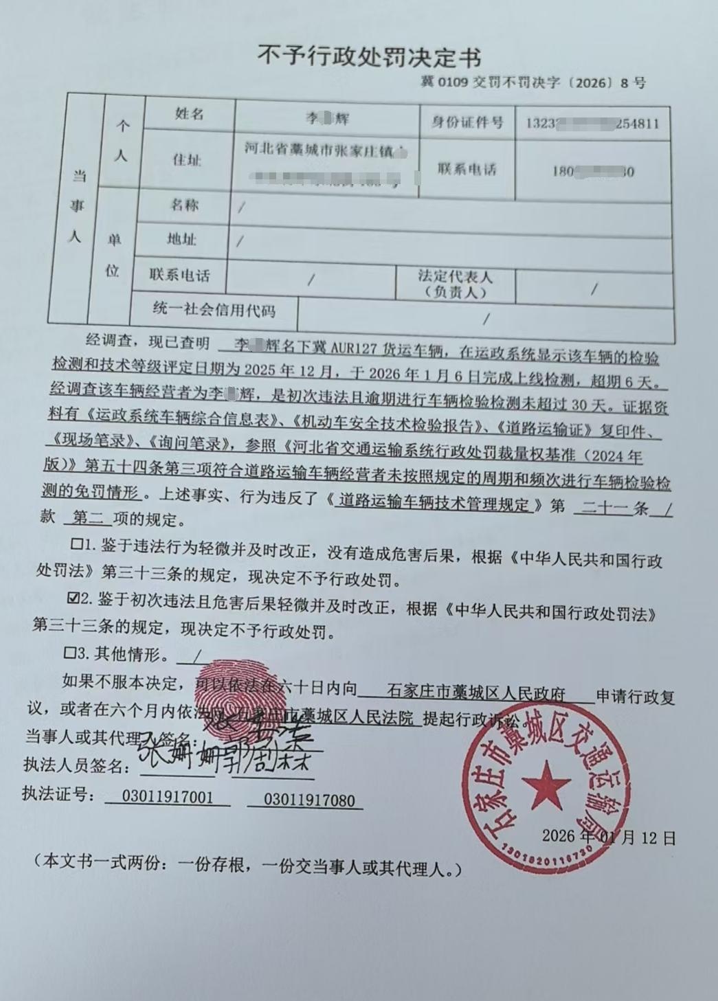 | 李*辉 | 自然人 | 身份证 | 132325********4811 | 冀0109交罚不罚决字〔2026〕8号 | 《道路运输车辆技术管理规定》第二十一条第二项 | 李*辉名下冀AUR127未按照规定的周期和频次进行车辆检验检测的案 | 依据《道路运输车辆技术管理规定》第三十一条,参照《中华人民共和国行政处罚法》第五十四条第三项的规定 | 不予处罚 | 2026.1.12 | 藁城区交通运输局 | FA06-002-15 |