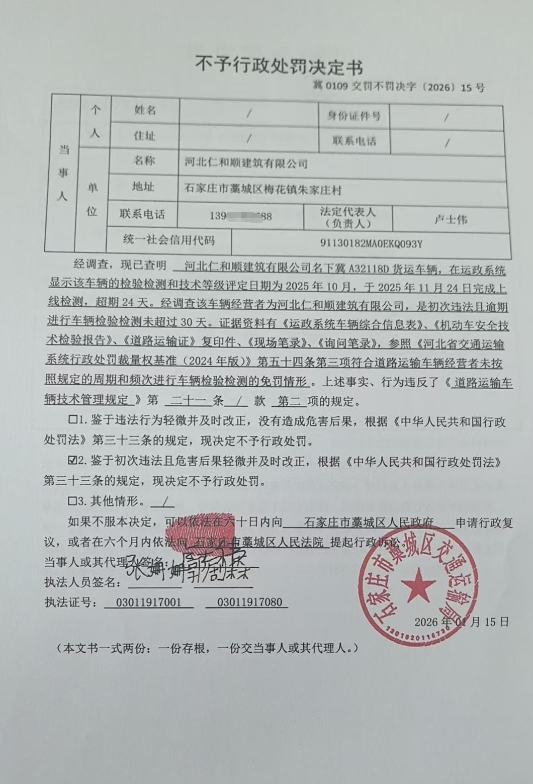 | 河北仁和顺建筑有限公司 | 法人 | 91130182MA0EKQ093Y | 卢士伟 | 身份证 | 132302********3819 | 冀0109交罚不罚决字〔2026〕15号 | 《道路运输车辆技术管理规定》第二十一条第二项 | 河北仁和顺建筑有限公司名下冀A32118D检验检测的案 | 依据《道路运输车辆技术管理规定》第三十一条、参照《中华人民共和国行政处罚法》第三十三条的规定 | 不予处罚 | 2026.1.15 | 藁城区交通运输局 | FA06-002-15 |