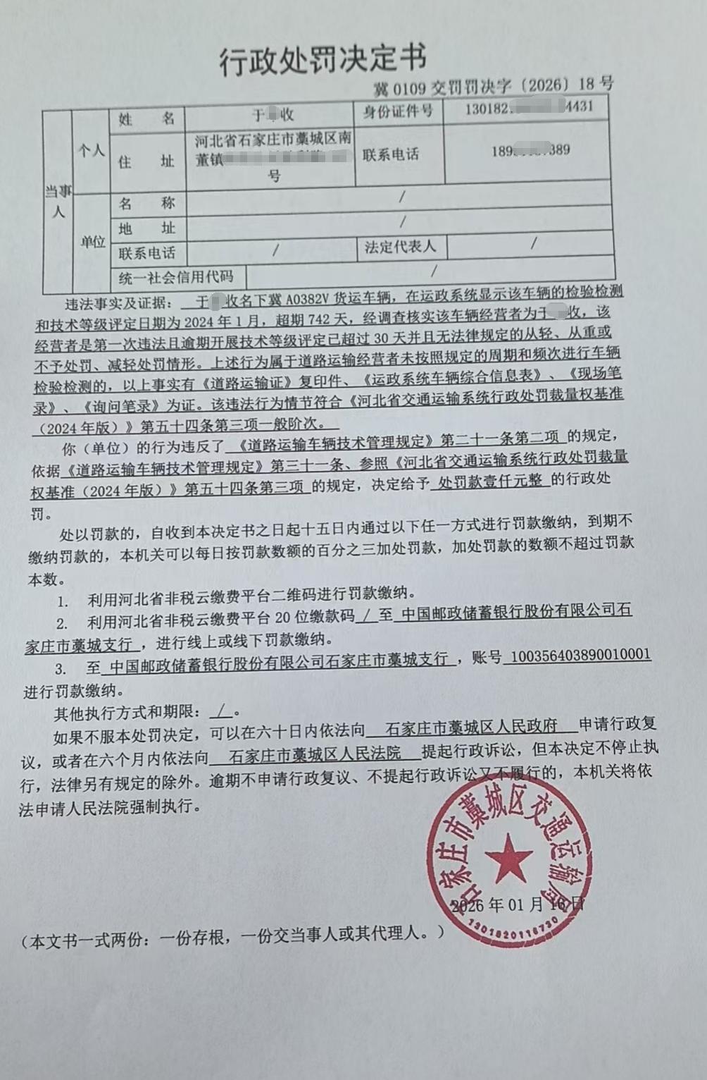 | 于*收 | 自然人 | 身份证 | 130182********4431 | 冀0109交罚罚决字【2026】18号 | 《道路运输车辆技术管理规定》第二十一条第二项 | 于*收名下冀A0382V未按照规定的周期和频次进行车辆检验检测的案 | 《道路运输车辆技术管理规定》第三十一条、参照《河北省交通运输系统行政处罚裁量权基准(2024年版)》第五十四条第三项 | 罚款 | 0.1 | 2026.1.16 | 藁城区交通运输局 | FA06-002-15 |