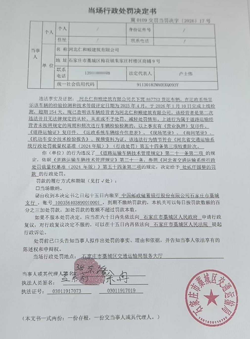 | 河北仁和顺建筑有限公司 | 法人 | 91130182MA0EKQ093Y | 卢士伟 | 身份证 | 132302********3819 | 冀0109交罚当罚决字【2026】17号 | 《道路运输车辆技术管理规定》第二十一条第二项 | 河北仁和顺建筑有限公司冀A677S3未按照规定的周期和频次进行车辆检验检测的案 | 依据《道路运输车辆技术管理规定》第三十一条,参照《中华人民共和国行政处罚法》第五十四条第三项的规定 | 罚款 | 0.2 | 2026.1.16 | 藁城区交通运输局 | FA06-002-15 |