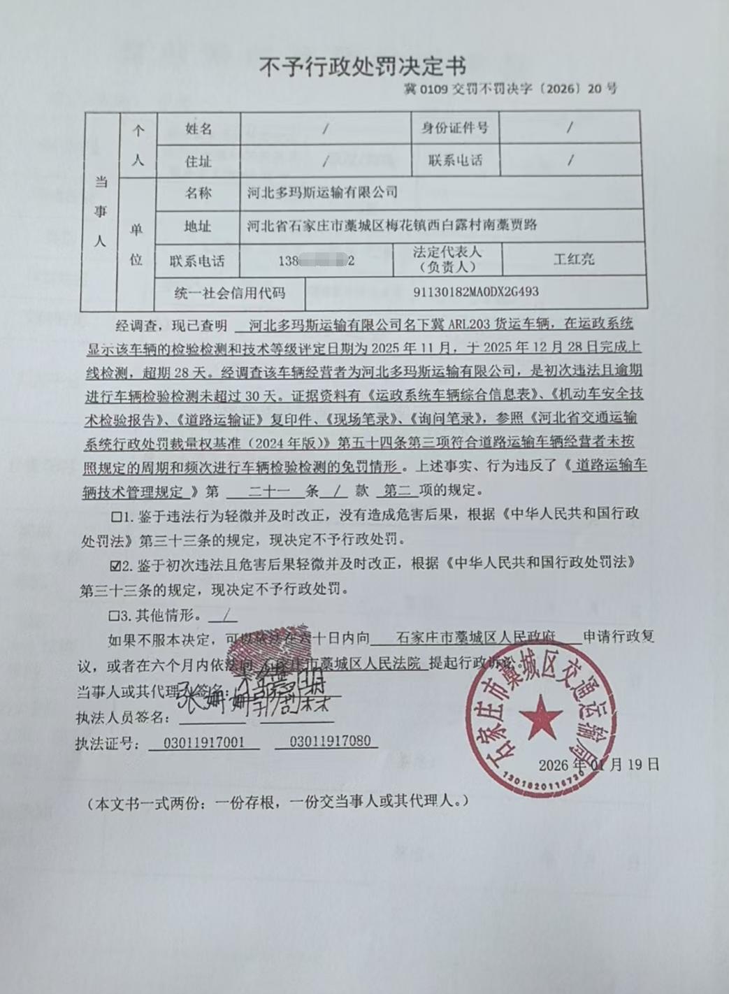 | 河北多玛斯运输有限公司 | 法人 | 91130182MA0DX2G493 | 卢士伟 | 身份证 | 130182********2914 | 冀0109交罚不罚决字〔2026〕20号 | 《道路运输车辆技术管理规定》第二十一条第二项 | 河北多玛斯运输有限公司名下冀ARL203检验检测的案 | 不予处罚 | 2026.1.19 | 藁城区交通运输局 | FA06-002-15 |