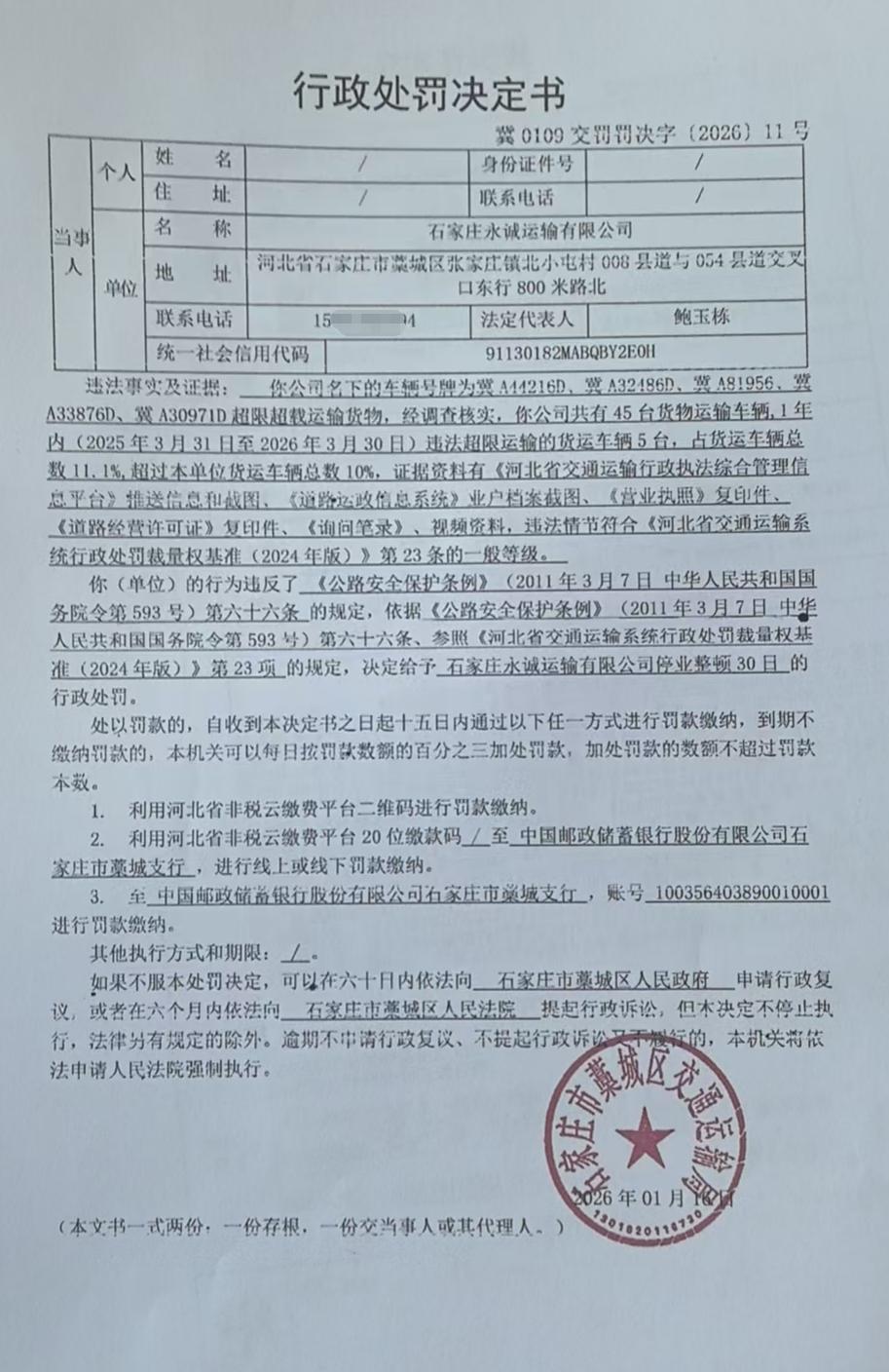 | 石家庄永城运输有限公司 | 法人 | 91130182MABQBY2E0H | 鲍玉栋 | 身份证 | 130182********4874 | 冀0109交罚罚决字【2026】11号 | 《公路安全保护条例》(2011年3月7日 中华人民共和国国务院令第593号)第六十六条 | 石家庄永城运输有限公司涉嫌1年内违法超限运输运输的货运车辆超过本单位货运车辆总数10%案 | 《公路安全保护条例》(2011年3月7日 中华人民共和国国务院令第593号)第六十六条、参照《河北省交通运输系统行政处罚裁量权基准(2024年版)第23条 | 责令停产停业 | 责令停业整顿30日 | 0 | 2026.1.16 | 藁城区交通运输局 | FA06-002-15 |