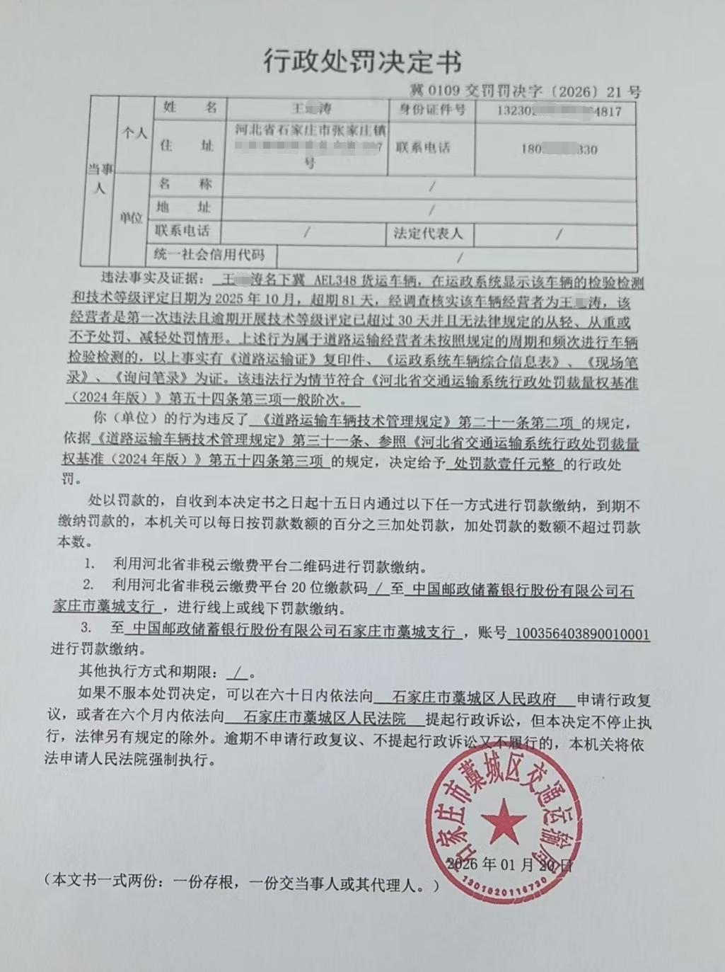 藁城区交通运输局行政处罚公示冀0109交罚罚决字【2026】21号