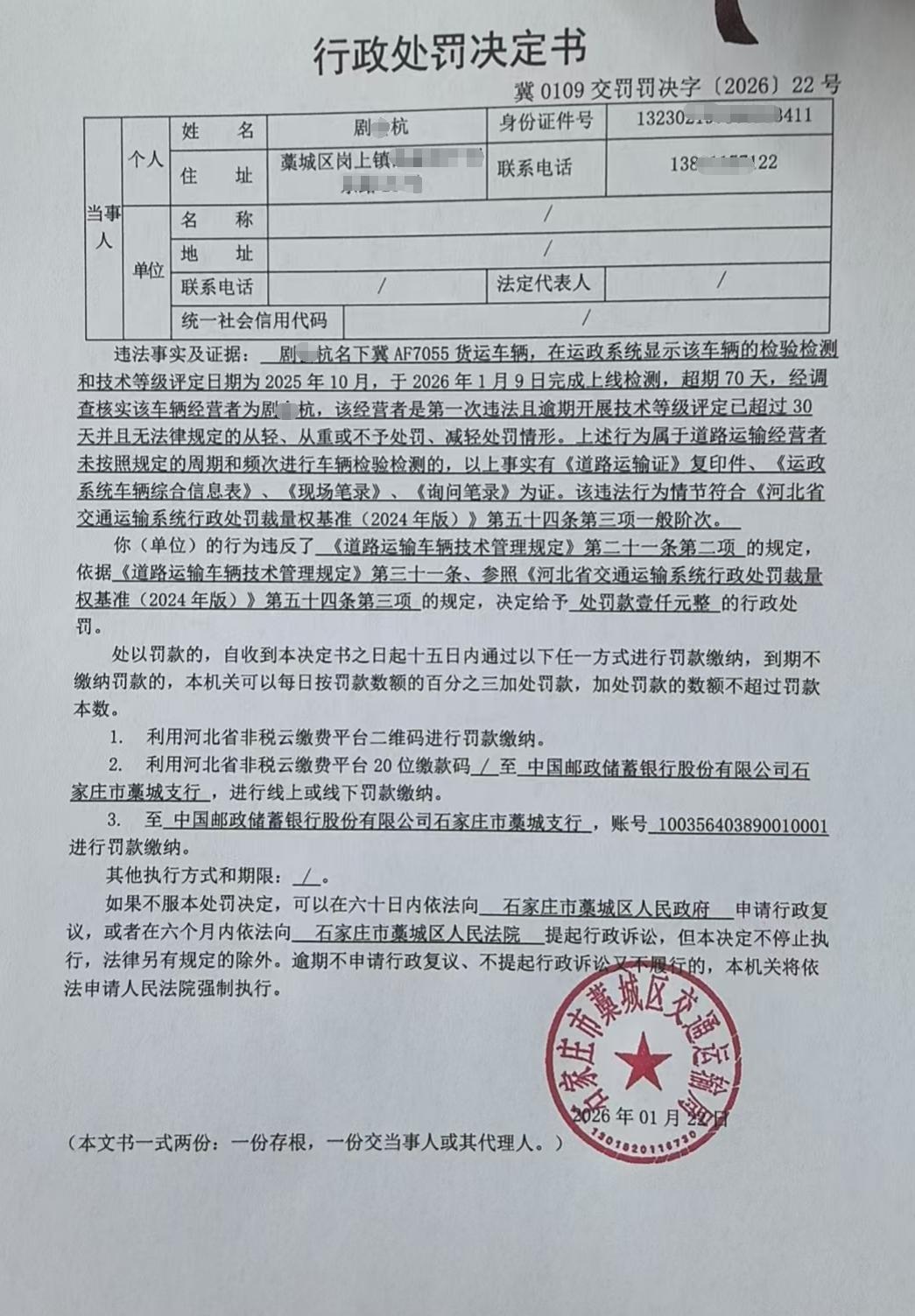 藁城区交通运输局行政处罚公示冀0109交罚罚决字【2026】22号